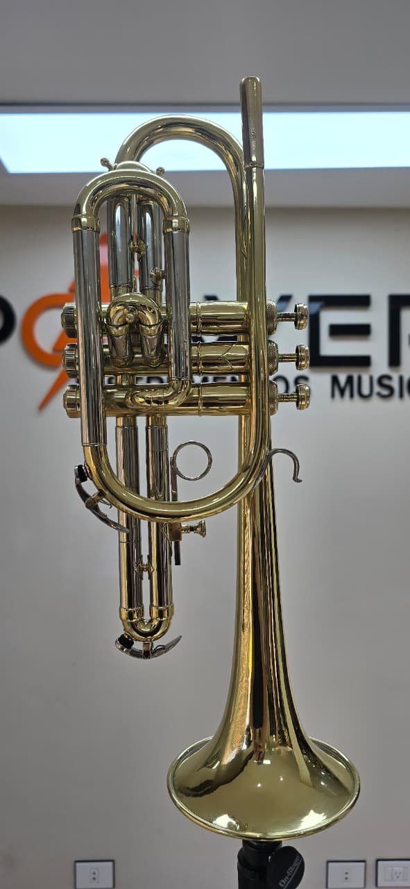 Condição do Instrumento: Por se tratar de um instrumento vintage/usado, o acabamento laqueado apresenta marcas de uso condizentes com sua trajetória, como leves riscos e áreas de desgaste natural. Esses detalhes são puramente cosméticos e não interferem na integridade estrutural ou na qualidade sonora excepcional do cornet.